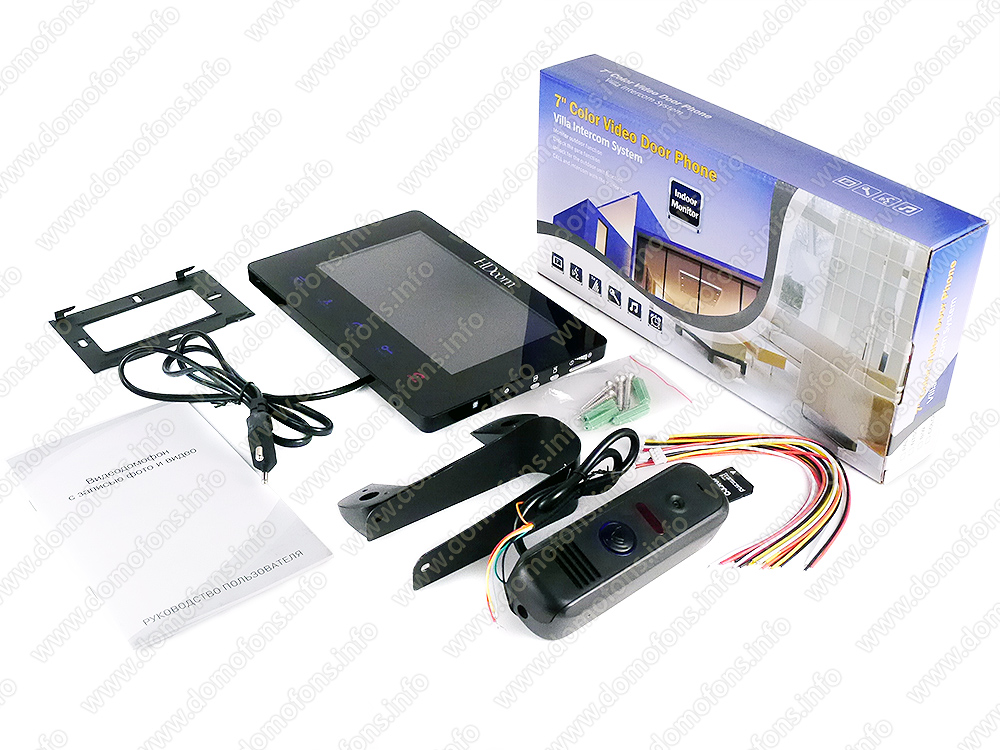 Проводной видеодомофон «HDcom B-707» это комплект видеомонитора и вызывной панели. Диагональ экрана монитора составляет 7 дюймов, оснащен сенсорными кнопками управления. Вызывная панель выполнена из металла, может устанавливаться на улице, оснащена встроенной видеокамерой с разрешением 800 ТВЛ. Систему можно расширить до четырех мониторов, двух видеопанелей, двух видеокамер и двух датчиков сигнализации. Один из видеоканалов можно настроить на детекцию движения с автоматической записью.